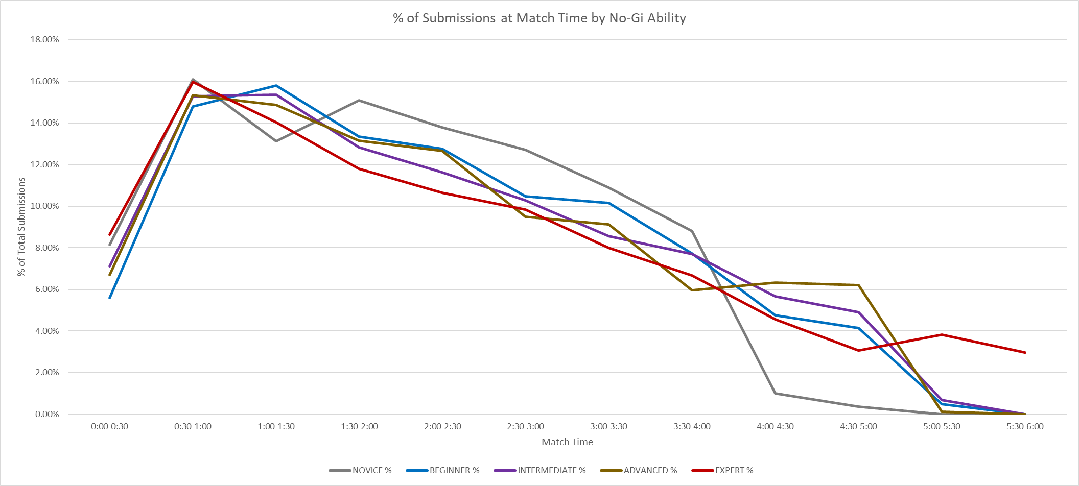 In the no-gi chart, we see that big spike across all abilities, and with the exception of the intermediate division, they all fall off, never reaching that peak again. Intermediate peaks in the 1:00-1:30 bucket, and then follows the same trend as the others. This could mean that no-gi matches tend to start with a lot more energy, a flurry of activity in the first minute to minute-and-a-half, and then it settles down into a more subdued pace.