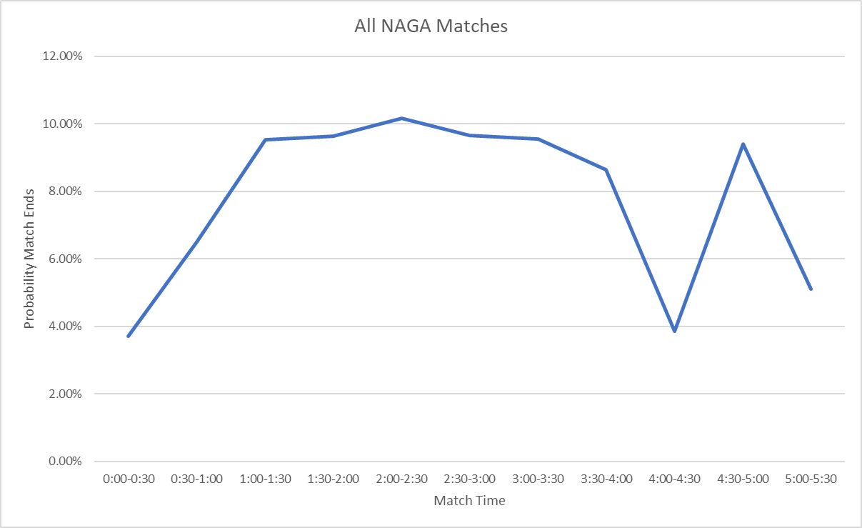 Once again, we see that the highest probability of the match ending occurs right in the middle. This is looking at all NAGA matches (20,873) and isn’t splitting out ability/belt, so take that for what its worth. As we saw in the previous example, there’s more volatility in gi matches, so I would expect that this chart will look different when we start digging down into the different layers. A project for another day.