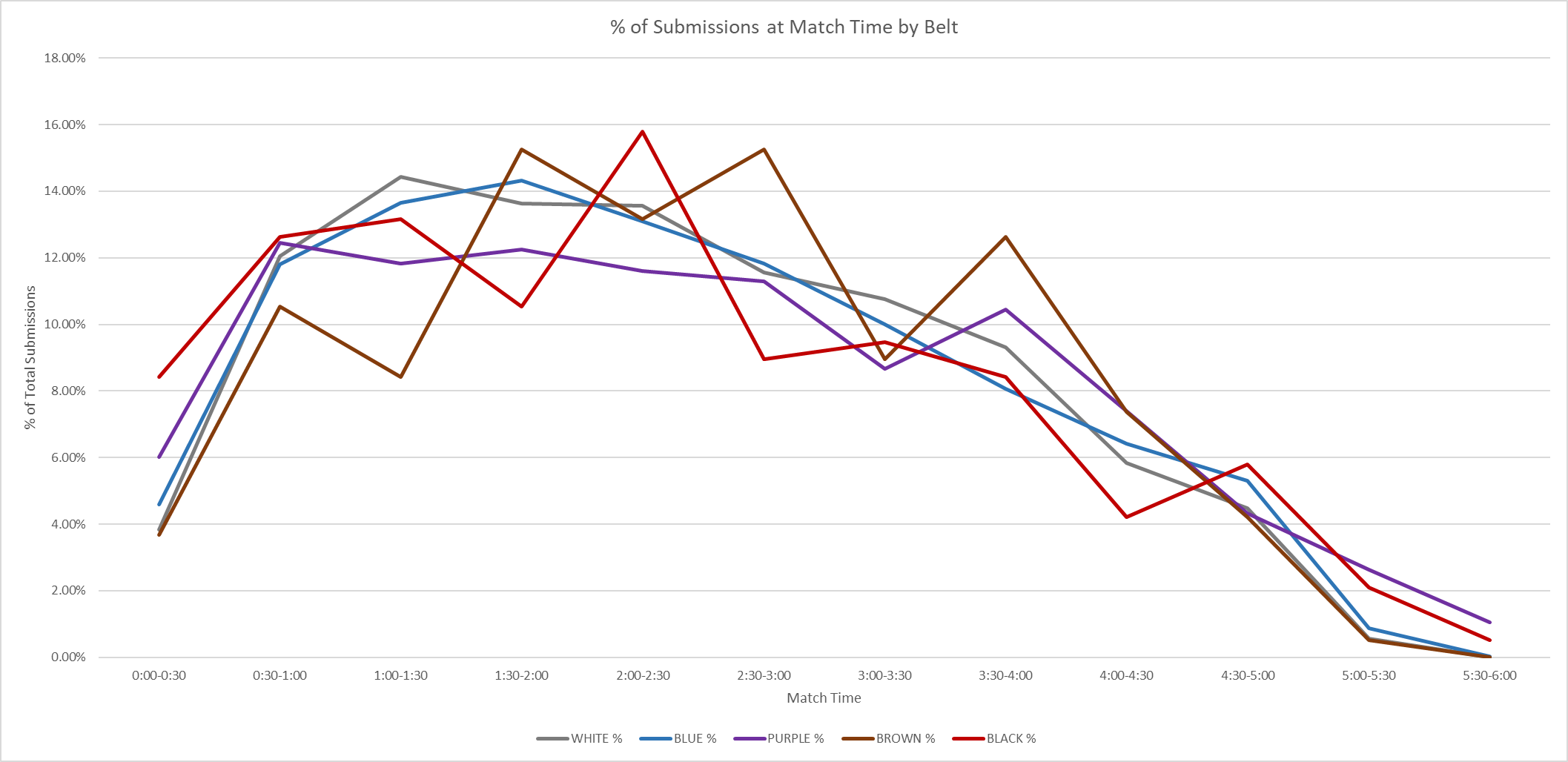 First, you’ll notice a big dip at the 4:00 mark. That’s to be expected, as that is where novice, beginner, white belt, and Masters matches end. All other ability levels go to either 5 or 6 minutes.